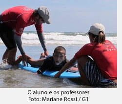 água com a ajuda dos professores. O menino então sobe na prancha – usada normalmente por pessoas cegas, já que é mais macia e tem algumas características que melhoram a postura do